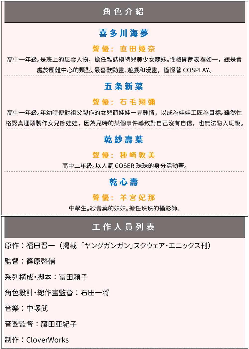 本作故事主要描述受到祖父影響的男主角五條新菜,從小立志成為女兒節娃娃工匠,但他的喜好卻無法被同儕接受,在班上顯得格格不入。升上高中後,新菜依然過著隱藏自己的邊緣生活,但沒想到他的興趣竟然被同班同學喜多川海夢發現!原以為自己的高中生涯即將畫下句點,卻因為精湛的縫紉技巧而被喜歡Cosplay的海夢相中,要求他為自己製作成人遊戲中的角色服裝!