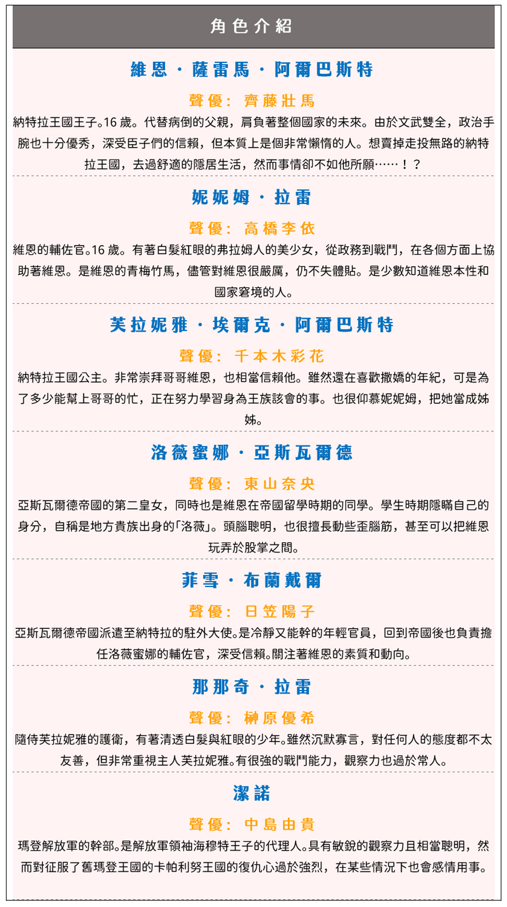 人氣聲優陣容集結,曾演出《憂國的莫里亞蒂》中天才莫里亞蒂教授的齊藤壯馬再次擔綱天才王子,不料卻處處弄巧成拙!曾飾演《Re:從零開始的異世界生活》銀髮精靈愛蜜莉雅的高橋李依,這次再度成為銀髮女神妮妮姆輔佐官,共同獻上幽默的互動演出,讓新的一年開場就有好心情。