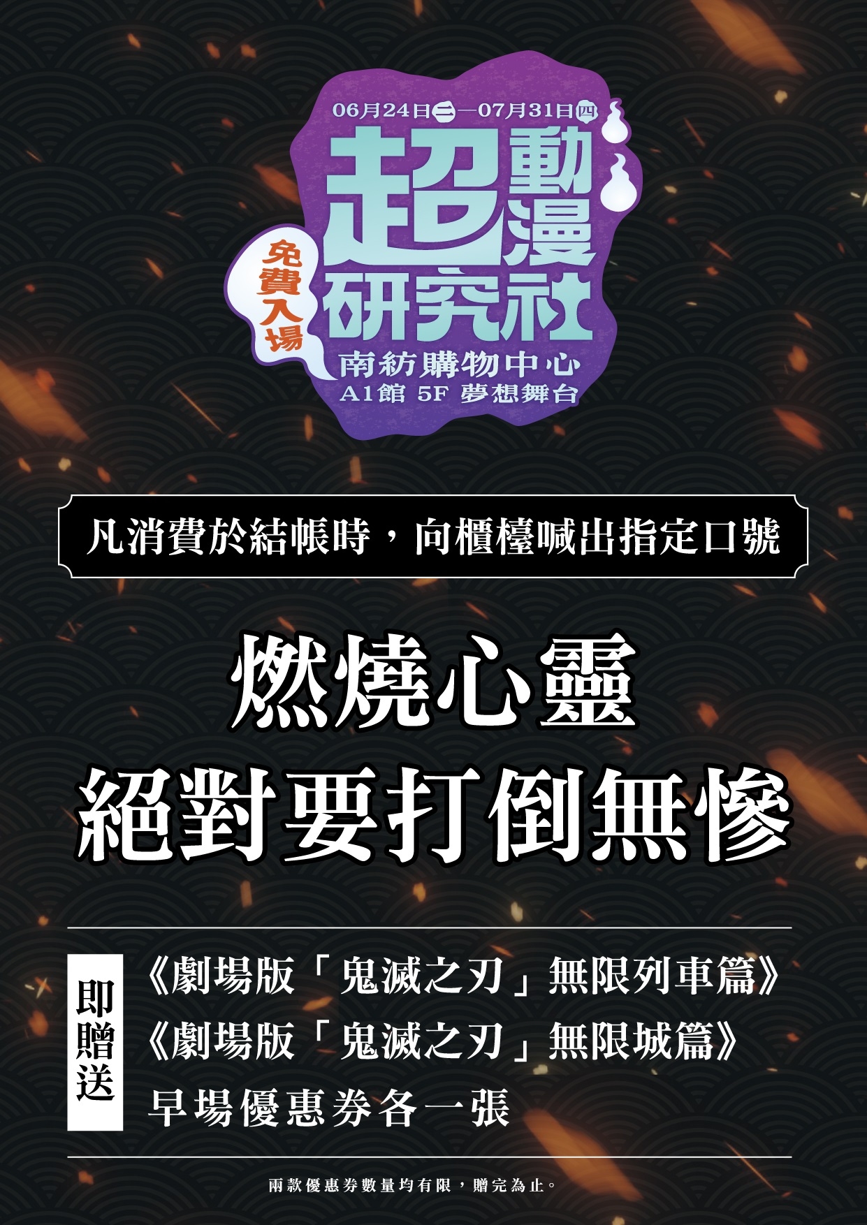 凡於超動漫研究社消費,並且於結帳時喊出指定口號「燃燒心靈,絕對要打倒無慘」,即可獲得《劇場版「鬼滅之刃」無限列車篇》與《劇場版「鬼滅之刃」無限城篇》早場優惠券各一張,兩款數量均有限,贈完為止。