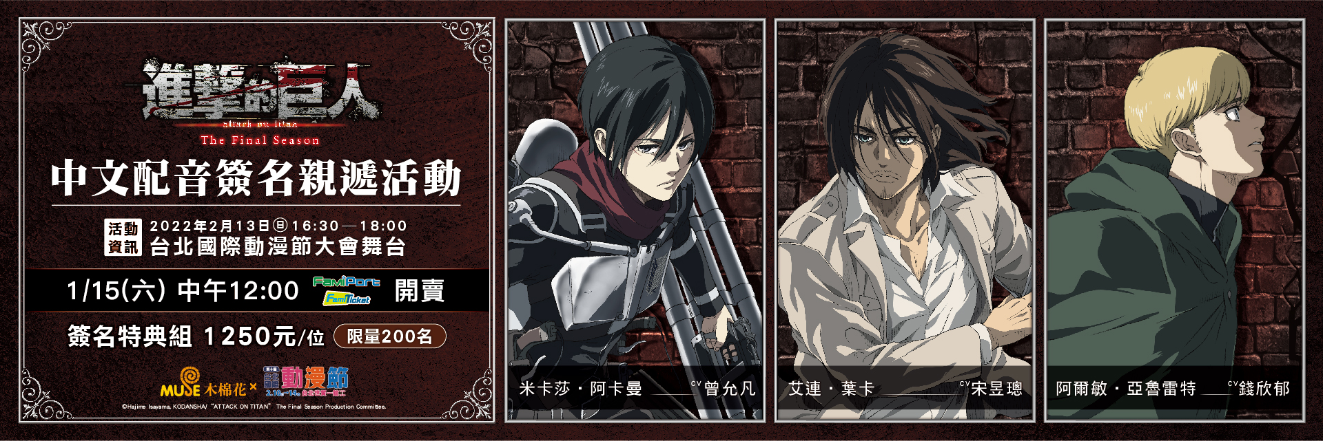 在今年盛大完結的《進擊的巨人》,動畫版即將進入白熱化的階段,緊張的劇情讓粉絲們都期待不已,可說是明年 1 月的重磅好戲,木棉花即將在「台北國際動漫節」2/13(日)16:30 舉辦「進 擊的巨人中文配音簽名親遞活動」,特別邀請飾演主角「艾連·葉卡」的宋昱璁老師、飾演「米卡莎· 阿卡曼」的曾允凡老師、「阿爾敏·亞魯雷特」的錢欣郁老師,三位老師首度同台與粉絲同樂。本作 中充滿人性的寫實劇情、精彩的戰鬥場面獲得了粉絲龐大的喜愛,在活動中老師們將演繹經典台 詞,粉絲們可以一同回味本作的震撼與感動!