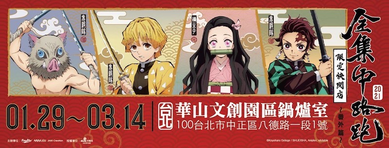 《鬼滅之刃劇場版無限列車》電影票房在台累計將達6億台幣,在日本更是飆破300億日幣。去年分別在台北、台中和高雄舉辦的三場鬼滅之刃全集中路跑現場,都聚集了上萬粉絲參與,北中南三地的快閃店更是人氣爆棚、排隊都排成了貪食蛇。2021年迎接開春之際,回應廣大鬼滅粉絲們的熱切期盼,「鬼滅之刃全集中路跑限定快閃店~番外篇~」強勢回歸台北,帶來全台灣最大、最齊全的鬼滅之刃周邊商品,30款台灣首發新品、熱騰騰日本直送周邊和熱賣追加的推薦商品,開幕首四日將限量發售7款人氣角色福袋,每天再送出100個印有鬼滅角色的祈福繪馬,消費滿額即贈新春限定紙袋,1/29起至3/14在華山文創園區,陪伴粉絲歡慶農曆新年假期,春節闔家出遊走春必踩景點。