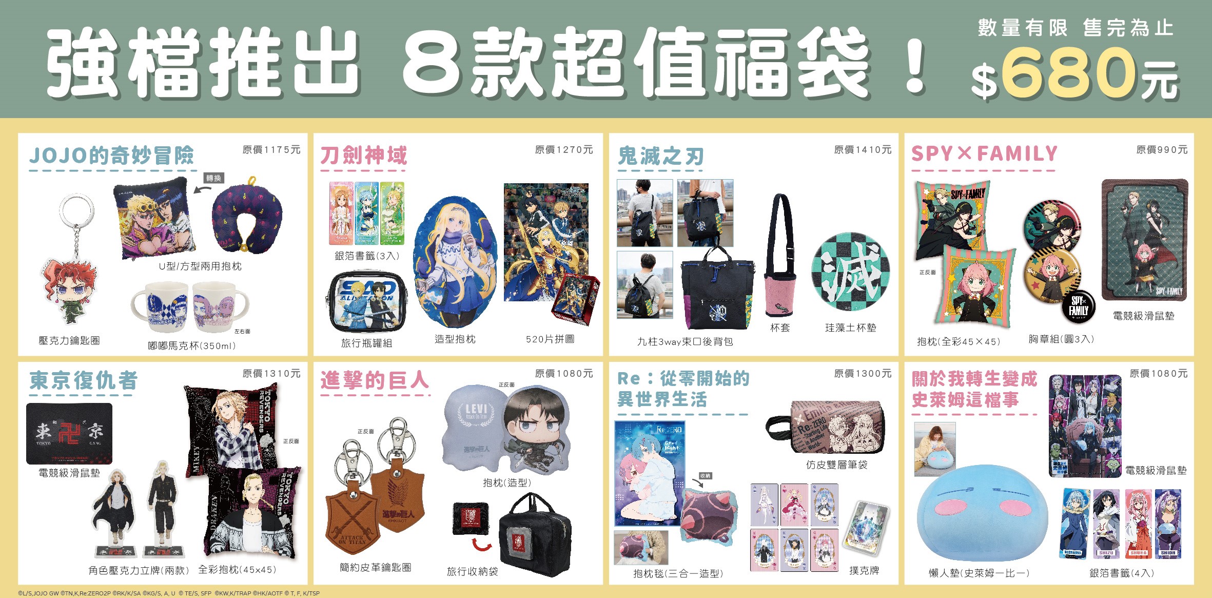 台中翻轉動漫祭更推出展場限定8款熱作福袋下殺680元48折起、兩件T恤任選39折、指定盲盒玩買三送一、單品優惠五折與100 元起等優惠活動。首推超搶手福袋組,熱作《SPY×FAMILY間諜家家酒》福袋,有雙面全彩抱枕,一面是阿妮亞可愛的笑臉,另一面則是「黃昏」與「約兒」的圖片、還有3入圓形胸章組以及電競級滑鼠墊,喜歡《SPY×FAMILY間諜家家酒》絕對要入手!還有《東京復仇者》福袋組有人氣角色「Mikey」與「Draken」雙面全彩抱枕與立牌、再搭上旗幟滑鼠墊,最帥氣的福袋組合!《進擊的巨人》福袋組則有Q版里維抱枕、實用的旅行收納袋與調查兵團團徽鑰匙圈,快帶著巨人周邊一起出門吧!不僅如此還有多部熱門作品福袋:《RE:從零開始的異世界生活》、《關於我轉生變成史萊姆這檔事》、《JOJO的奇妙冒險》、《刀劍神域》、《鬼滅之刃》等,內容物從抱枕、滑鼠墊、馬克杯、後背包,從實用到值得收藏的周邊品項應有盡有,快趁下殺的時候一次入手吧!