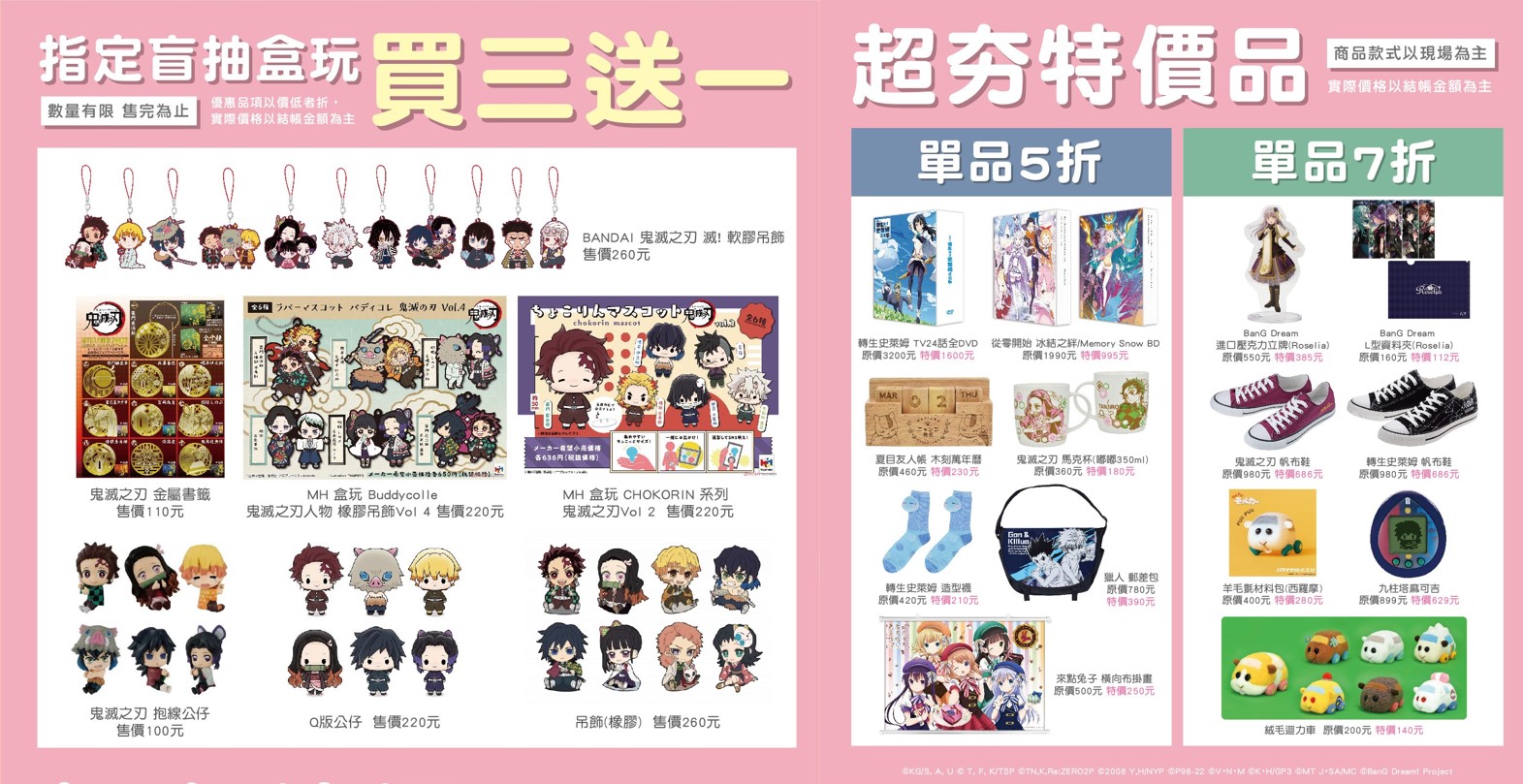 不僅有折扣,還有眾多台中翻轉動漫祭首賣新品《SPY×FAMILY間諜家家酒》華麗鑰匙圈、日貨公仔與玩偶,《戀上換裝娃娃》全彩抱枕、角色壓克力立牌,以及《進擊的巨人》全彩抱枕與運動毛巾,現場還有《東京復仇者》、《鬼滅之刃》、《轉生變成史萊姆》等等的新品,結帳時也別忘了拿滿額贈,消費滿$999元即可獲得《鬼滅之刃》鏤空金屬書籤隨機一款,消費滿$2099元即可獲得《輝夜姬想讓人告白~天才們的戀愛頭腦戰~》造型抱枕,想知道詳細優惠及好玩的動漫資訊,可以持須關注木棉花粉絲專頁!