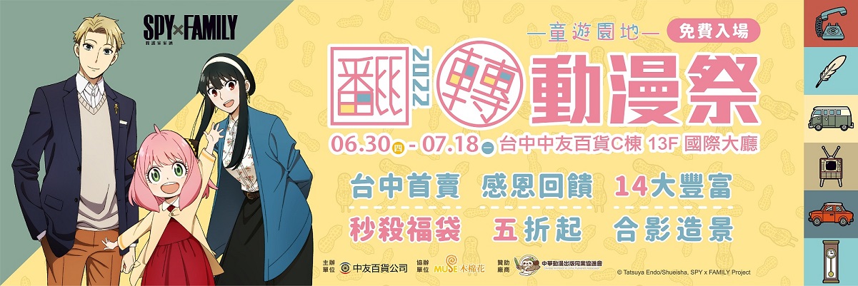動畫代理商與中友百貨聯合舉辦了「台中翻轉動漫祭」,活動將於6月30日至7月18日於台中中友百貨登場C棟13樓登場,讓民眾可以免費參觀,集結了近期熱門動畫合影區,讓粉絲們身歷其境!有近期最火紅的動畫作品《SPY×FAMILY間諜家家酒》、《進擊的巨人》﹑《86不存在的戰區》、《戀上換裝娃娃》等場景區,還有8款福袋、滿額贈、商品下殺五折等優惠,超豐富的活動內容等著動漫迷們一起嗨翻整個夏天。