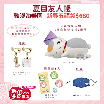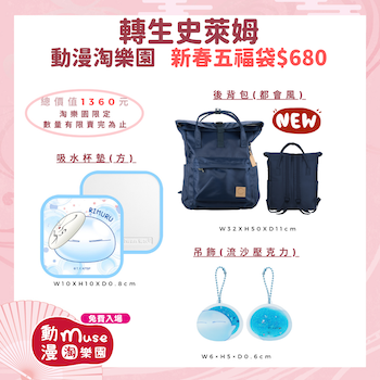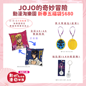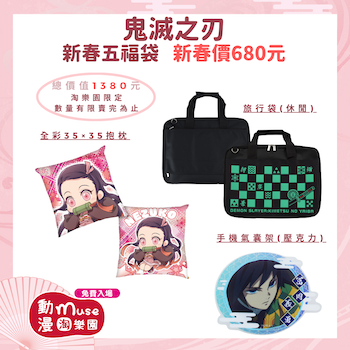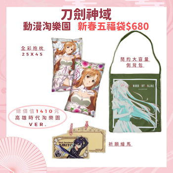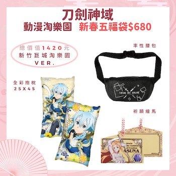大家最喜歡的福袋這次也沒缺席,新春五福袋原價破千元,五款最低 5 折起,推出了超人氣 動畫《鬼滅之刃》、《刀劍神域》、《夏目友人帳》、《關於我轉生變成史萊姆這檔事》、《JOJO 的奇妙 冒險》,有旅行袋、側背包、後背包各式包款,還有娃娃、抱枕可以抱回家,每一款都好豐富又喜 歡,都只有在動漫淘樂園才可以買的到,快相約家人朋友一起來走春。