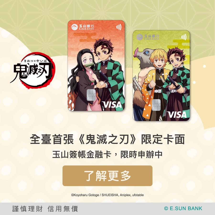 *玉山簽帳金融卡鬼滅之刃限定版限透過e指開戶申辦,兄妹款及夥伴款卡面限選擇一款申辦。