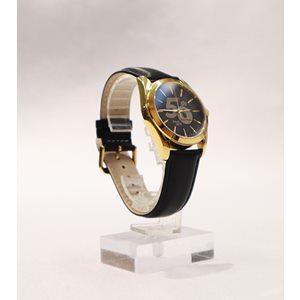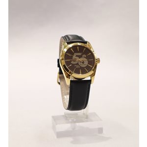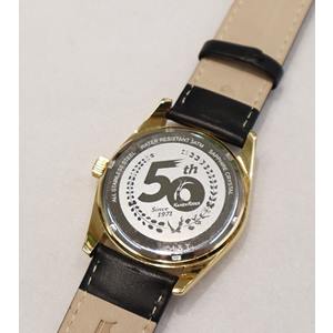 ∎ 304 不鏽鋼錶身+小牛皮錶帶,金色錶身搭配黑色面底與錶帶正面 50 週年 logo採卡其色印刷。