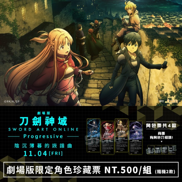 電影上映前,必收的就是預售票套組了,《刀劍神域劇場版 -Progressive- 陰沉薄暮的詼諧曲》的預售開賣日,特別選在「亞絲娜」生日9月30號開賣,這次推出『劇場版限定角色珍藏票』,共預備了『桐人』、『亞絲娜』、『亞魯戈』、『米特』4款角色收藏票,隨機出貨2款,整組只要500元,憑本次預售票,至影城現場劃位,還能兌換入場特典。預售平台包括博客來售票網、買動漫、金石堂購物網、安利美特線上商店等4大平台同步販售。眾多《刀劍神域》相關周邊,目前也於「木棉花樂園」商城熱售中,更多《刀劍神域劇場版-Progressive-陰沉薄暮的詼諧曲》最新消息,也將陸續公開,各位觀眾不妨多加關注。