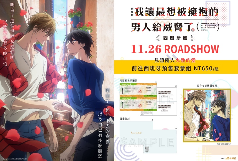 本次最令粉絲們期待的,就是兩人將在「東谷准太」的根源「西班牙」擦出的新火花!並且開始解鎖准太的主線故事,各位熱愛本作的觀眾與粉絲也將可以在大螢幕前,享受2人的互動帶來的「心動」!為了讓粉絲在進戲院前提早感受這股浪漫熱情的悸動,特別獻給大家這組「前往西班牙預售套票組」,內含原作老師「桜日梯子」繪製的手稿色紙、以及代表2人飛往西班牙的「雙人機票造型電影票」,老師以率性手稿所描繪下的高人與准太,在環繞玫瑰花海之間深情凝望,場景更是在准太的故鄉,光是拿在手中就不斷放送愛的電波,令人想要進戲院看到更多互動!這波「前往西班牙預售套票組」絕對值得大家用熱情讓它下架,整組雙人套票只要650元,並且在雙十連假前夕10月8日,於博客來售票網、金石堂網路書店、買動漫、 安利美特線上商店 同步開放預購,迫不及待見證兩人愛情的後續了嗎?不妨快與好友同好分享本日的好消息,再將動畫用力刷一遍,欲知更多電影上映消息,記得隨時鎖定木棉花官網與木棉花官方社群,本片動向隨時不漏接!