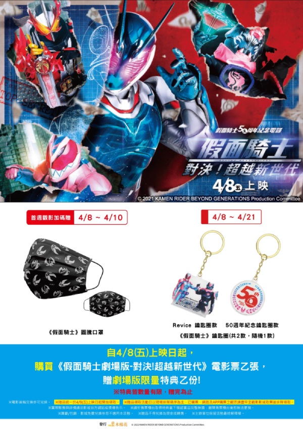 本次《假面騎士劇場版-對決!超越新世代》是適合全家同樂的普遍級,同時為了與喜愛假面騎士的觀眾共同慶祝50週年,片商特別準備上映期間的入場特典活動,凡是持預售票或者現場購票、網路訂位,現場取票的觀眾,上映日起劃位取票的同時,都有機會隨票獲贈《假面騎士》鑰匙圈1個。這次共預備「假面騎士Revice」與「假面騎士50週年彩色版」2種,款式採隨機贈送。另外於上映首3日觀影,還特別加碼贈「假面騎士Revice」與「假面騎士SABER」的圖騰口罩1份,所有的特典都是數量有限,贈完為止。想要拿到50週年紀念周邊的粉絲,記得密切關注上映場次與影城公告,和家人朋友共同觀賞本次騎士們跨越100年的宏偉故事!