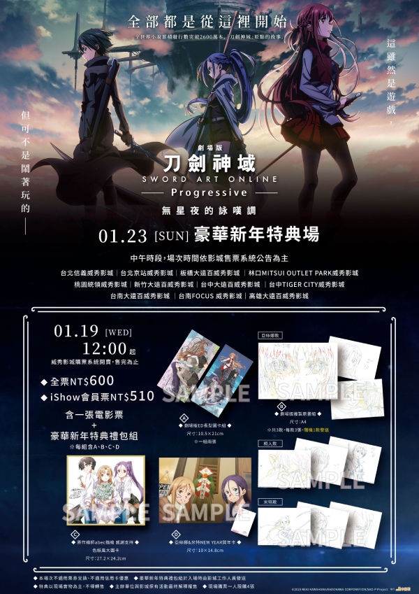 「《刀劍神域 –Progressive–無星夜的詠嘆調》豪華新年特典場」採限量預售票制,每張票都有「豪華新年特典禮包組」,每組內均含日本同款劇場版ED長形圖卡一組(每組二張)、劇場版複製原畫組一份(共計三款原畫,隨機贈送一款)、原作繪師abec描繪的「感謝支持」色紙風大圖卡一份、亞絲娜&米特NEW YEAR賀年卡,每組電影套票售價600元,除了能一次擁有精選特典之外,還有收納用的專屬珍藏信封;活動預售票將於1月19日中午12點,在威秀影城網站售票系統開賣。